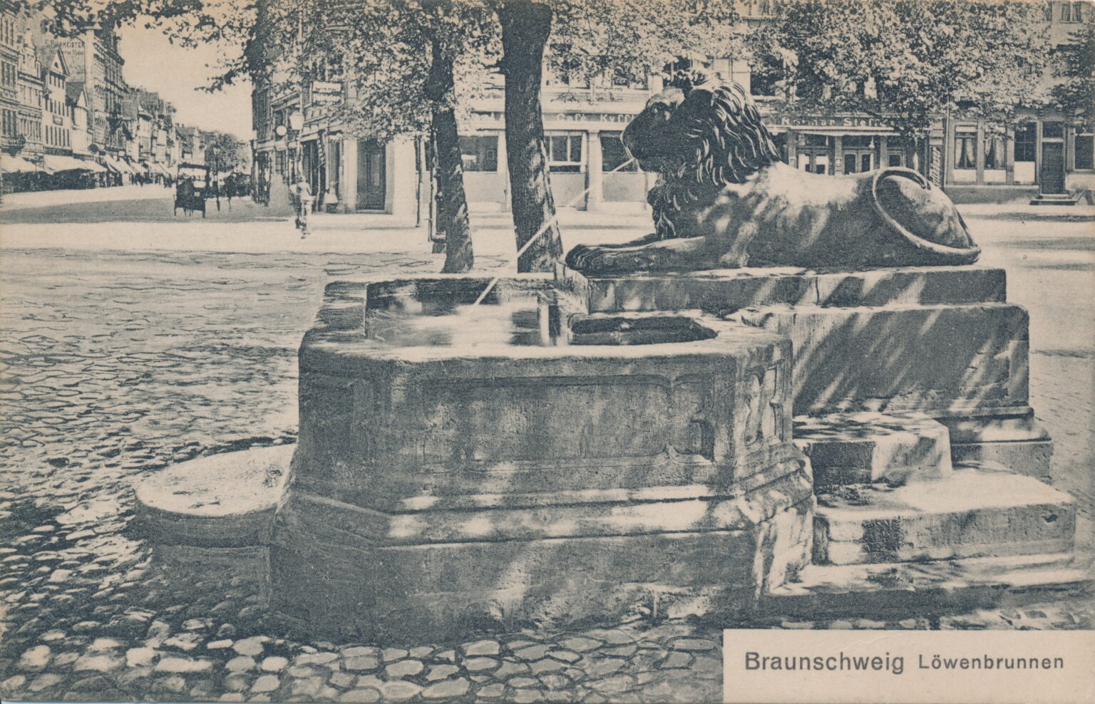 Wir begegnen auch heute in unserer Stadt oft einer Beziehung zum Löwentier und seien es die Fußballer der Eintracht, die den Beinamen „die Löwen“ tragen und 1967 sogar Deutscher Fußballmeister wurden. Die Löwenplastik des Brunnens wurde vom gleichen Modell gefertigt, aus dem die vier Obelisken-Löwen am Löwenwall sind. Gegossen ebenso wie diese in einer Gießerei in Zorge im Harz, die das ursprüngliche Modell noch liegen hatte. Insgesamt gibt es 7 Löwen dieses Modells: 4 beim Obelisken, 2 für das Steintor, heute vor der Wolfenbütteler Bibliothek und der Löwenbrunnen. Das Brunnenwasser diente den Pferden und den Händlern des nahen Hagenmarktes vor der Katharinenkirche als Durstlöscher und zum Waschen.