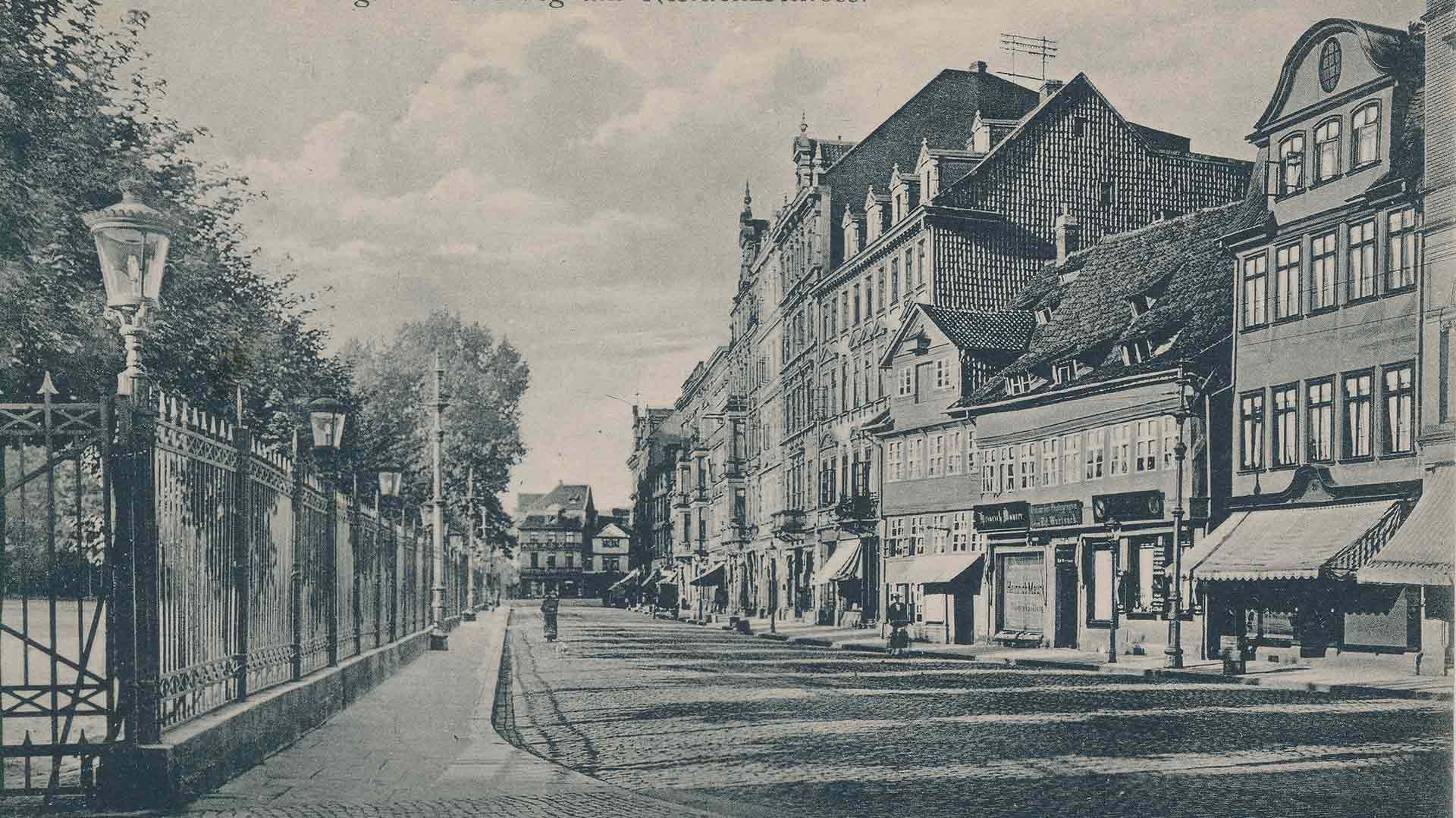 Daher wurden sie immer weiter als Tankstelle mit angeschlossenem Kiosk ausgebaut und in meiner Jugendzeit so um 1978 herum waren sie auch weit und breit die einzigen, wo wir noch unseren Bedarf an „Genussmitteln“ decken konnten. Zurück zum Bohlweg: Mit unserer Phantasie können wir uns lebhaft vorstellen, wie in alter Zeit Damen und Herren in wilhelminischer Kleidung hier entlang flanierten und zu abendlicher Stunde unter Gaslaternen einkauften, die Hektik der heutigen Zeit war noch fremd. Der Schlossvorplatz, der für Feierlichkeiten und militärische Paraden genutzt wurde, war eingezäunt und reichte bis an den Bohlweg heran, schön zu sehen auf der Ansicht von 1906.