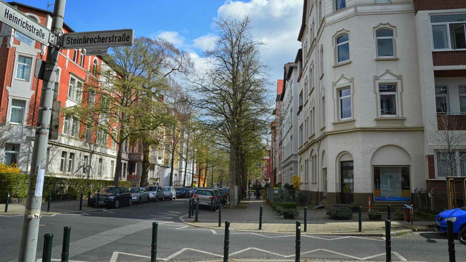 Die auf der Ansicht von 1910 zu sehende Querstraße ist die Hagenstraße, die nach 1945 in Steinbrecherstraße umbenannt wurde. Die Heinrichstraße hatte damals große, schöne Gründerzeithäuser. Diese Bausubstanz ist bis heute größtenteils erhalten geblieben, wie wir auf der Ansicht von 2016 sehen können. Kleinere Kriegsschäden wurden beseitigt, die Bäume sind sicherlich nicht mehr die alten und die schmiedeeisernen Zäune sind fast alle verschwunden. Das Kopfsteinpflaster musste einer modernen Asphaltdecke weichen und es wurden Einstellplätze für die heute reichlich vorhandenen Pkws geschaffen. Dennoch auch hier eine Altbauidylle wie sie im Buche steht. Kolonialwarengeschäft Carl Beek Die alte Ansichtskarte zeigt uns rechter Hand das Kolonialwarengeschäft (heute genutzt von einem gemeinnützigen Verein) von Carl Beek, der auch der Initiator der Karte sein könnte. Es war damals verbreitet, dass Geschäftsinhaber sich zur Imagepflege Ansichtskarten drucken ließen, auf denen ihr Geschäft, der Inhaber und die Belegschaft bzw. wie hier die Familie zu sehen war. Emailletafeln übernahmen die Warenwerbung, wie zum Beispiel für Liebigs Fleischextrakt oder Thompsons Seifenpulver. Zudem waren auf Schiefertafeln mit Kreide die tagesaktuellen Sonderangebote verzeichnet. Ein besonderes Detail verlangt unsere Aufmerksamkeit: Links vom Eingang des Geschäfts steht einer der ersten Verkaufsautomaten Deutschlands. Aus der Antike weiß man, dass der Grieche Heron von Alexandria im ersten Jahrhundert n. Chr. einen Weihwasserautomaten mit Münzeinwurf entwickelt hatte. Um 1870 entstanden die ersten neuzeitlichen Automaten in den USA und in den 1880er Jahren in England. In Deutschland war es die Kölner Firma Stollwerk, die 1887 den ersten Münzautomaten mit Namen Rhenania herstellte und mit ihren Schokoladenriegeln und auch mit Zündhölzern füllte. Bei dem Automaten auf der Ansicht könnte es sich um einen etwas späteren Stollwerkautomaten handeln, für den Sammler heute eine fünfstellige Eurosumme bezahlen würden.