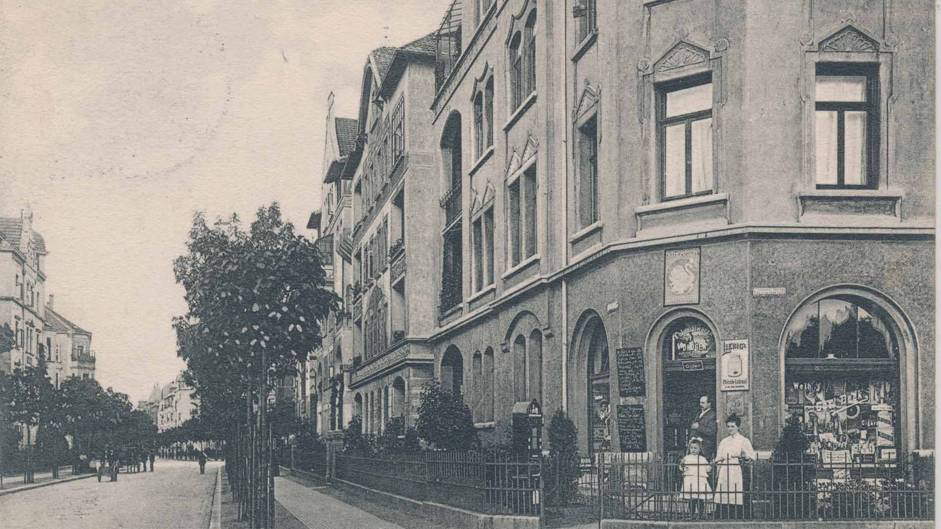 1910: Blickrichtung Hagenring – der Geschäftsinhaber posiert mit der Familie vor seinem Laden.