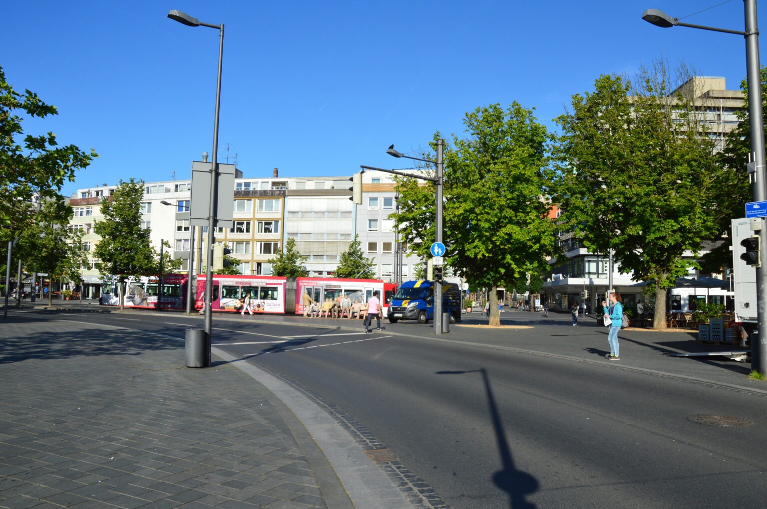 2017: Hinter Bäumen versteckt als Fußgängerzone von Nachkriegsbauten gesäumt.