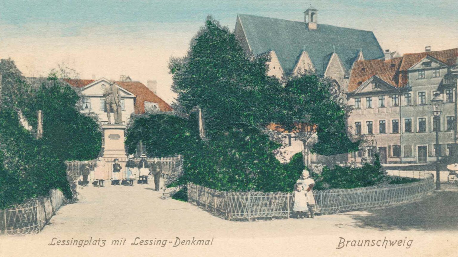 Der ursprüngliche Lessingplatz in Braunschweig lag im südlichen Innenstadtgebiet um das im Jahr 1853 errichtete Lessing-Denkmal herum. Heute heißt der gesamte Bereich zwischen der Villa Salve Hospes und der ehemaligen Garnisonsschule so. Bis 1933 teilte sich dieses Areal in zwei Plätze, einmal den größeren Siegesplatz im südlichen Bereich und dem nördlichen „kleinen“ Lessingplatz. Zwischen 1933 und 1950 hieß der gesamte Bereich Siegesplatz. Unsere Ansicht von 1903 ist vom kleinen Lessingplatz. Der Namensgeber Gotthold Ephraim Lessing (1729 Kamenz-Oberlausitz – 1781 Braunschweig) war ein bedeutender Dichter des rationalen Denkens der deutschen Aufklärung des 18. Jahrhunderts. Lessing war Magister der sieben freien Künste. Seit der Antike galten die drei Fächer Grammatik, Rhetorik und Dialektik im sprachlichen, sowie die vier Fächer Arithmetik, Geometrie, Musik und Astronomie im mathematischen Bereich als die dem freien Mann angemessene Bildung. Im Mittelalter dienten sie der Vorbereitung auf die Fakultäten Theologie, Jurisprudenz und Medizin. Nach Braunschweig kam Lessing 1770. Er wurde Bibliothekar in der Herzog August Bibliothek von Wolfenbüttel. Diese Stellung verschafften ihm Personen aus dem Umfeld des Herzogs mit dessen ausdrücklichem Wohlwollen. So wie es heißt, wurde sie für Lessing freigemacht. Er konnte mit dieser Anstellung finanzielle Probleme in den Griff bekommen. 1771 nahm ihn die Freimaurerloge „Zu den drei Rosen“ in Hamburg in ihren Kreis auf. Lessing reiste 1775 mit dem Braunschweiger Prinzen Leopold nach Italien, zu der Zeit die Kulturnation, wo er, wie auch später Goethe, seinen kulturellen Horizont erweiterte. 1776 heiratete er Eva König verw. Hahn. Diese starb 1778 nach der Geburt und kurz darauf folgendem Tod des gemeinsamen Sohns Traugott am Kindbettfieber. Lessing litt an Asthma und diese Schicksalsschläge mögen dazu beigetragen haben, dass er durch eine Erkältung geschwächt am 17. Februar 1781 an Serothorax (Brustwassersucht) starb. In seinem Todeshaus am Aegidienmarkt unterhielt er eine Wohnung. Er soll sich bis zuletzt angeregt über Kirchenpolitik unterhalten haben.