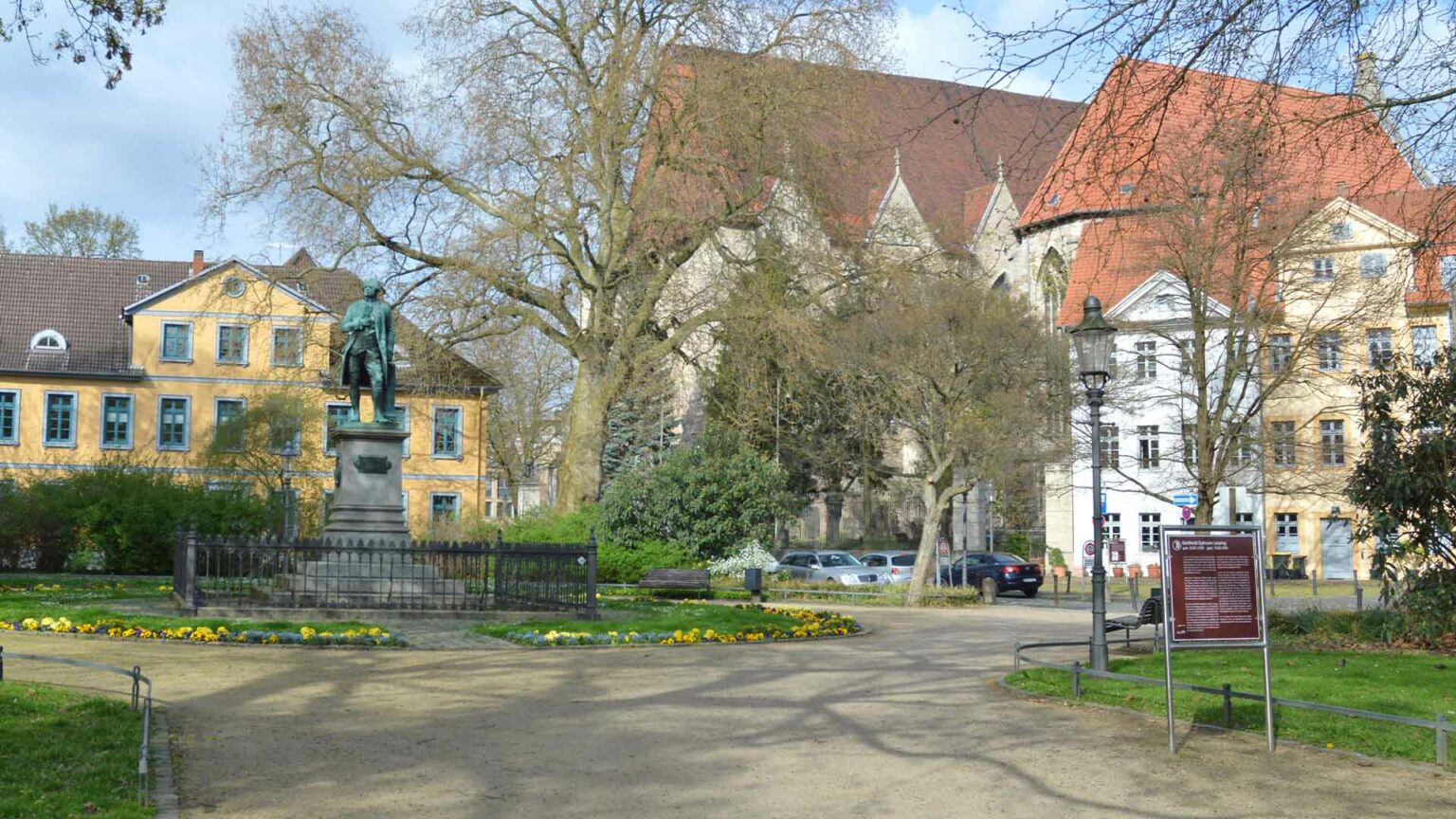 Lessing fand seine letzte Ruhestätte auf dem Braunschweiger Magnifriedhof, wo auch heute noch sein Grab zu besuchen ist. Lessing war in Deutschland einer der führenden Aufklärer und Vordenker des neuen Selbstbewusstseins des Bürgertums. Durch seine Leistungen wurde der Weg zur späteren „Volksherrschaft“, der Demokratie bereitet. Sein letztes und wohl bekanntestes Werk: „Nathan, der Weise“ handelt zur Zeit des dritten Kreuzzuges (1189 bis 1192) im Heiligen Land und setzt sich mit der Stellung der drei Weltreligionen Christentum, Islam und Judentum zueinander auseinander. Hier wird die Frage der einzig wahren Religion aufgeworfen – unter dem Aspekt der Toleranzidee, eben andere und fremde Überzeugungen gelten zu lassen. Die Hauptfigur Nathan erweist sich durch seine beeindruckende Persönlichkeit als der Mittler zwischen den verschiedenen Ansichten des Sultans, des Tempelherrn und seiner Religion. Man muss sich bewusst machen, dass Lessing dieses Werk unter Eindruck des Todes seiner nächsten Familienangehörigen und seines nahenden eigenen Todes geschrieben hat. Sollten Sie es nicht kennen, meine Empfehlung. Das markante klassizistische Fachwerkgebäude im Hintergrund unserer Bilder beherbergte die Garnisionsschule, deren Eröffnung 1796 Herzog Karl Wilhelm Ferdinand veranlasste. Hier wurden Kinder von Streitkräften der Braunschweiger Garnison, besonders der Aegidienkaserne unterrichtet, diese grenzte unmittelbar an das Grundstück. Der 2. Weltkrieg fügte dem Gebäude schweren Schaden zu, nach 1945 setze man es instand, den westlichen Teil allerdings nur einstöckig. Der Platz ist ein viel zu wenig beachtetes Juwel in der hektischen Großstadt.