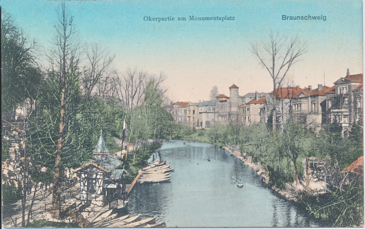 Die Okerpartie am Monumentsplatz (wegen des Obelisken als Monument) – heute Löwenwall – auf den Ansichtskarten um 1900, bezog sich auf den Teil der Oker von der heutigen Kurt-Schumacher-Straßen-Brücke in nördlicher Richtung.