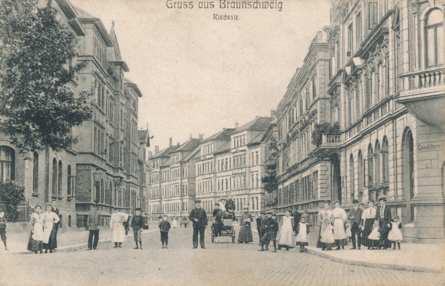 Die Riedestraße war und ist umschlossen von einem Gewerbegebiet, in dem heute verschiedene Firmen aktiv sind. Zur Zeit unserer Ansicht um 1907 war die größte Firma das Büssing-Werk. Heute ist es die Traditionsbrauerei Wolters (gegr. 1627 – an die Wolfenbüttler Straße gezogen 1876), zu Zeiten des Brauvorgangs riecht die Luft nach Hopfen und Maische, das ist nicht jedermanns Sache.