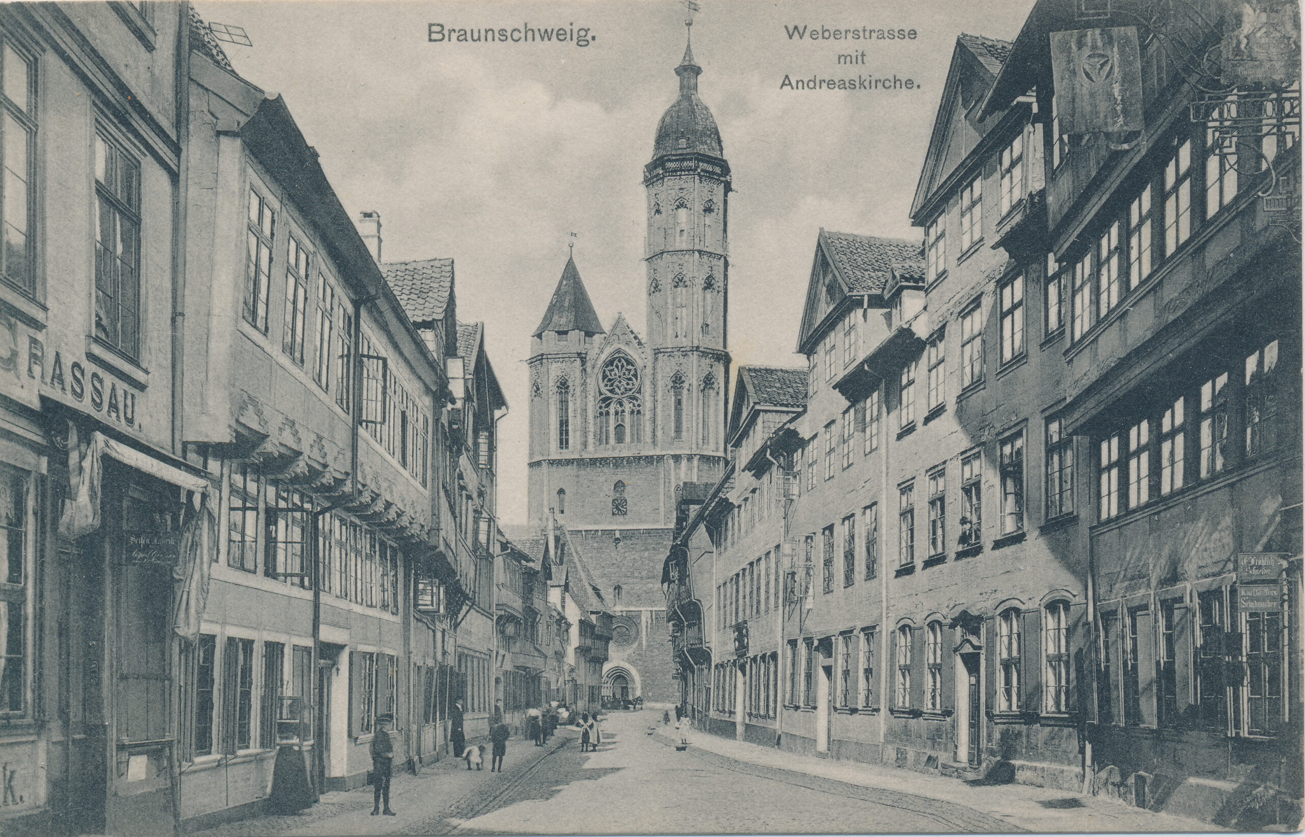 Der Blick fiel damals, wie auch heute, aus der Straßenschlucht auf die imposante Erscheinung der Andreaskirche (Fertigstellung etwa 1420), die mit ihrem Südturm 1544 mit 122 Meter eines der höchsten deutschen Bauwerke war. Derzeit misst der Turm 93 Meter und ist auch damit der höchste Kirchturm Braunschweigs.